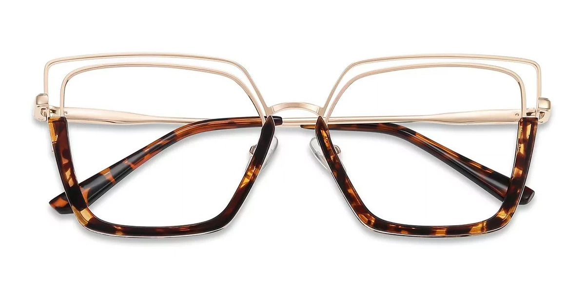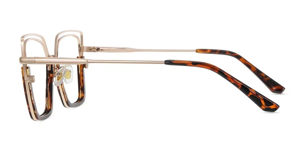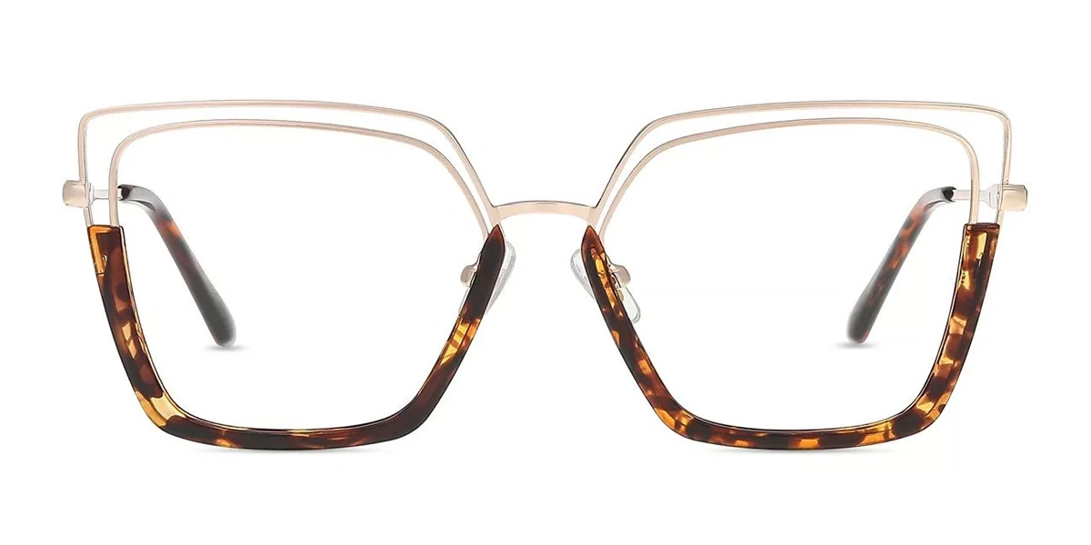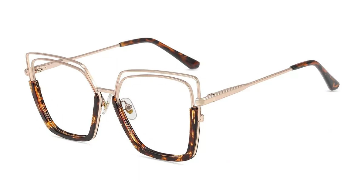This is a pair of glasses with a unique design and large square frame. The upper part of the frame is made of gold bimetallic wire structure, and the lower part of the frame is made of solid TR90 material, which surrounds the square shape. The temples are smooth polished high-quality metal to match the frame. The overall aesthetic of the glasses is modern and stylish. There are four colors to choose from, black, brown, safflower, and tortoiseshell colors.