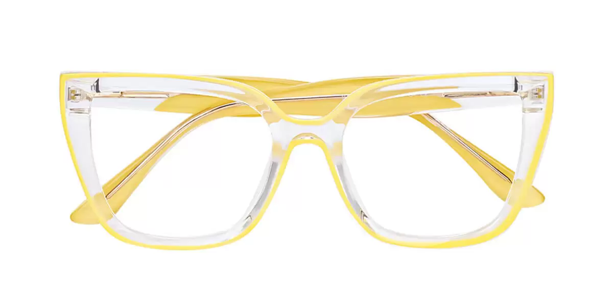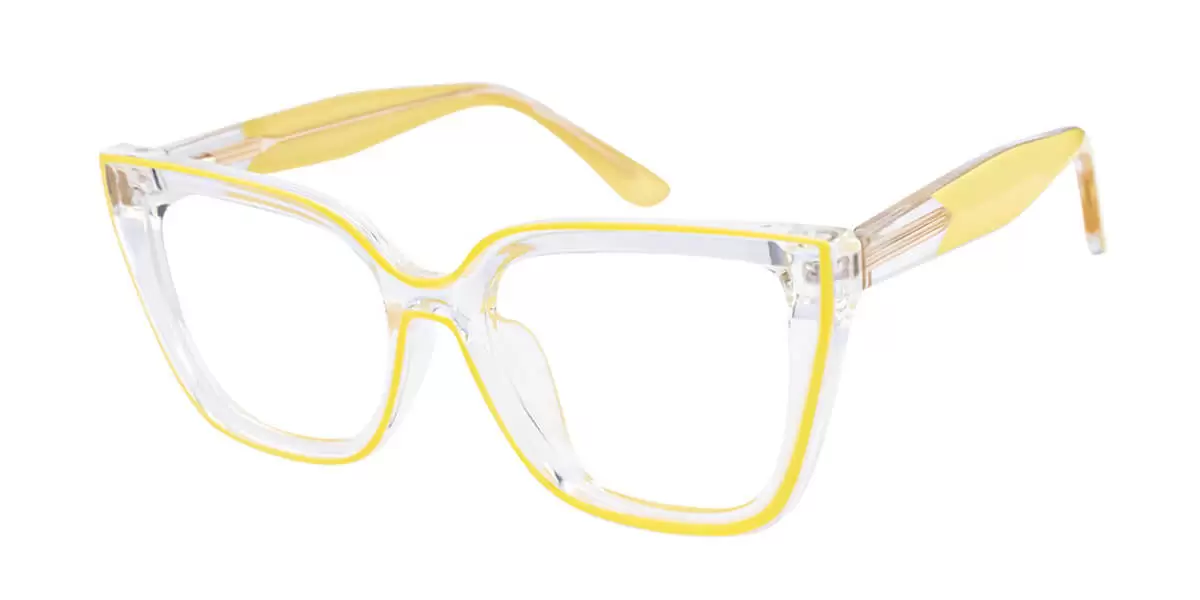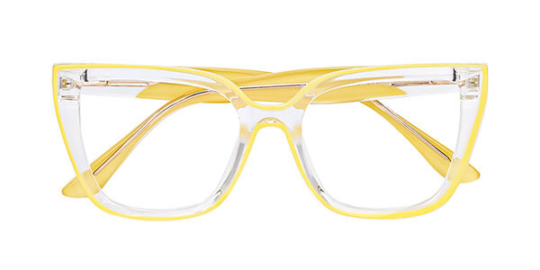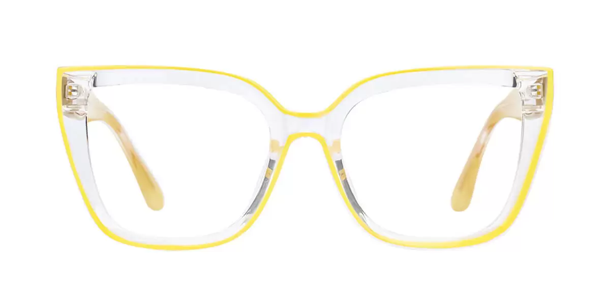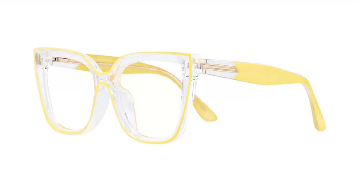 These eyeglasses feature handcrafted frames made of extremely lightweight, durable, and flexible TR90 polymer plastic. The thick frames are hand-polished to a smooth satin finish for a polished yet understated look. The two-tone temple arms come in solid black or yellow and are connected to clear temple tops, clearly displaying the high-quality spring hinges and metal alloy rods embedded in the arms.