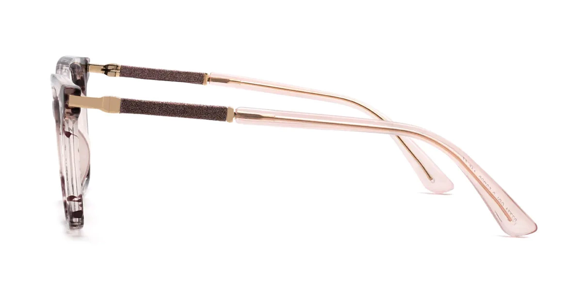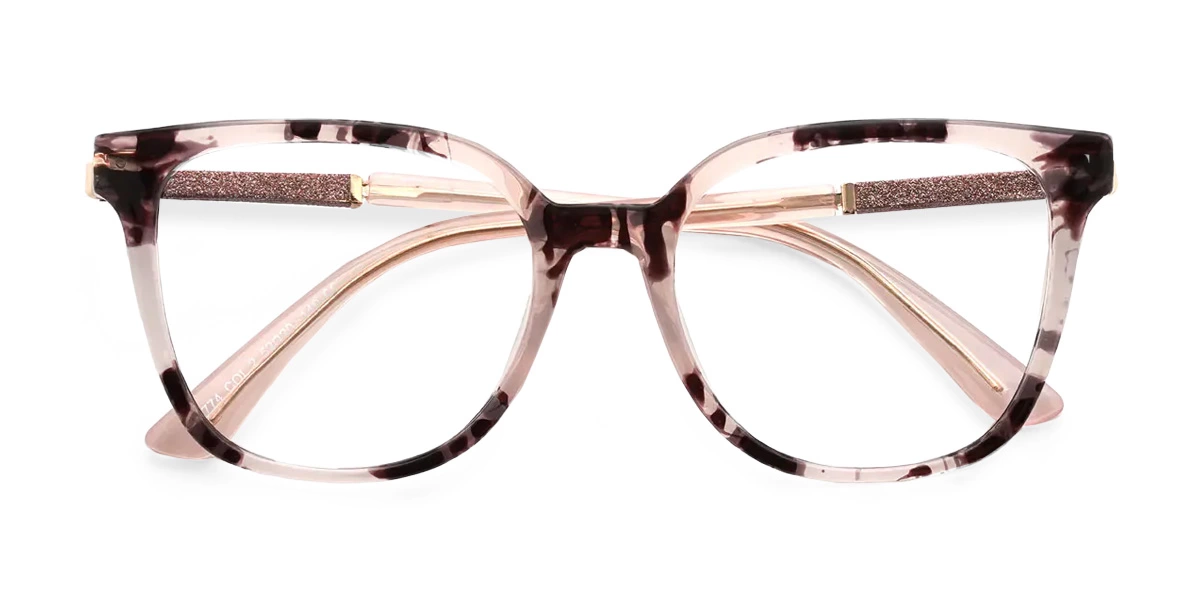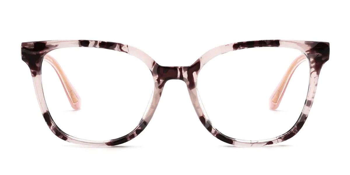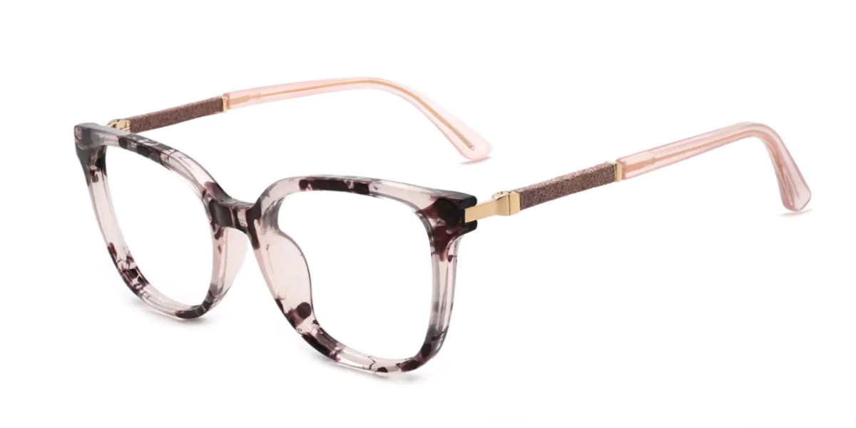 The frames have a colorful, layered design and are available in the following polish colors: black, pink-tortoise, purple, and purple-tortoise.
