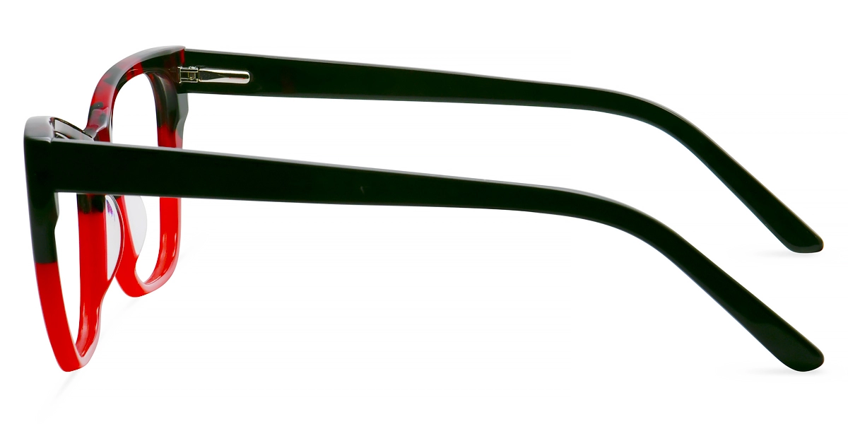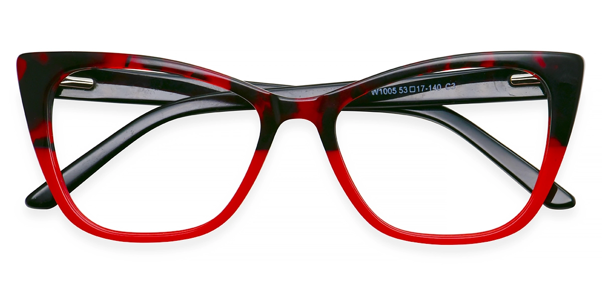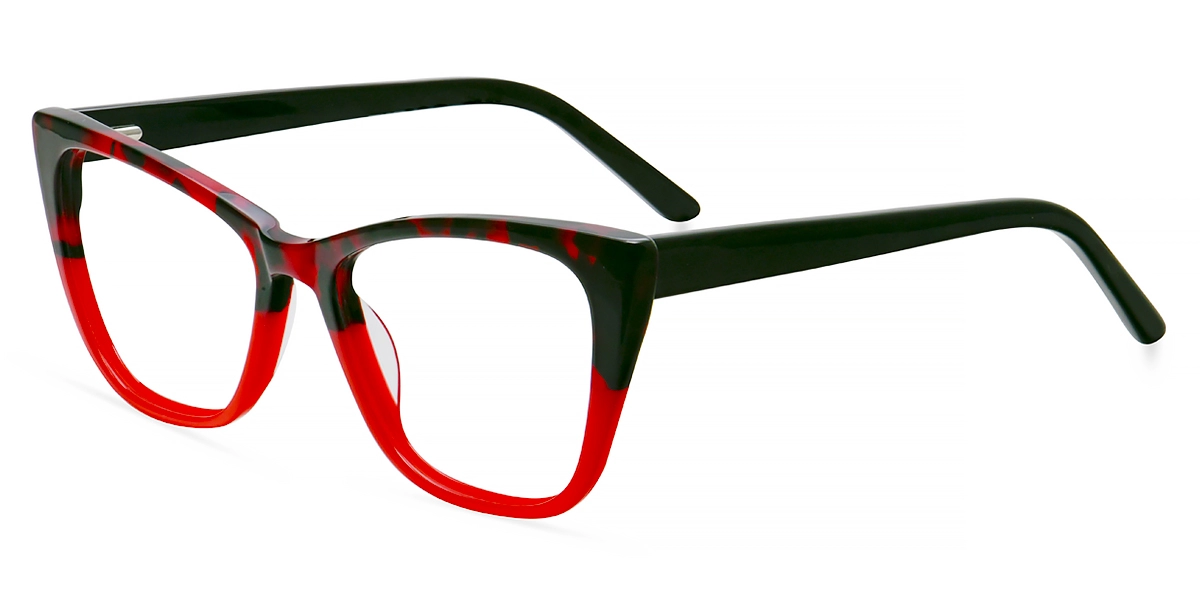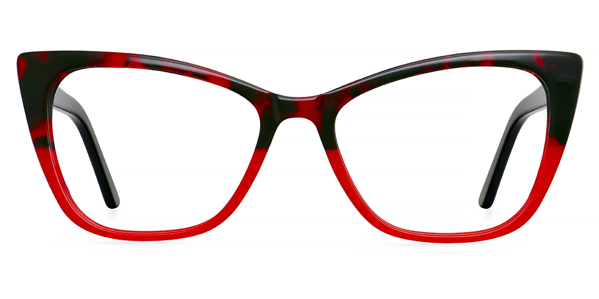 Turn heads with these cat eye glasses featuring a two-tone acetate frame for a chic, artistic flair. The top half of the front frame sports a stylish black and red floral print, while the bottom is a solid, vibrant red.