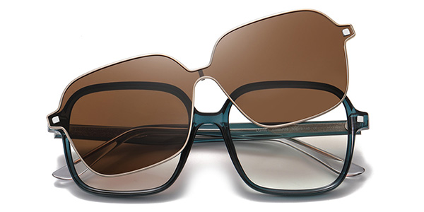 Choose from three stylish color combinations: a dark purple frame paired with matching purple polarized clip-on lenses, a dark green frame with brown polarized clip-ons, or a black frame with gradient gray polarized clip-on lenses.